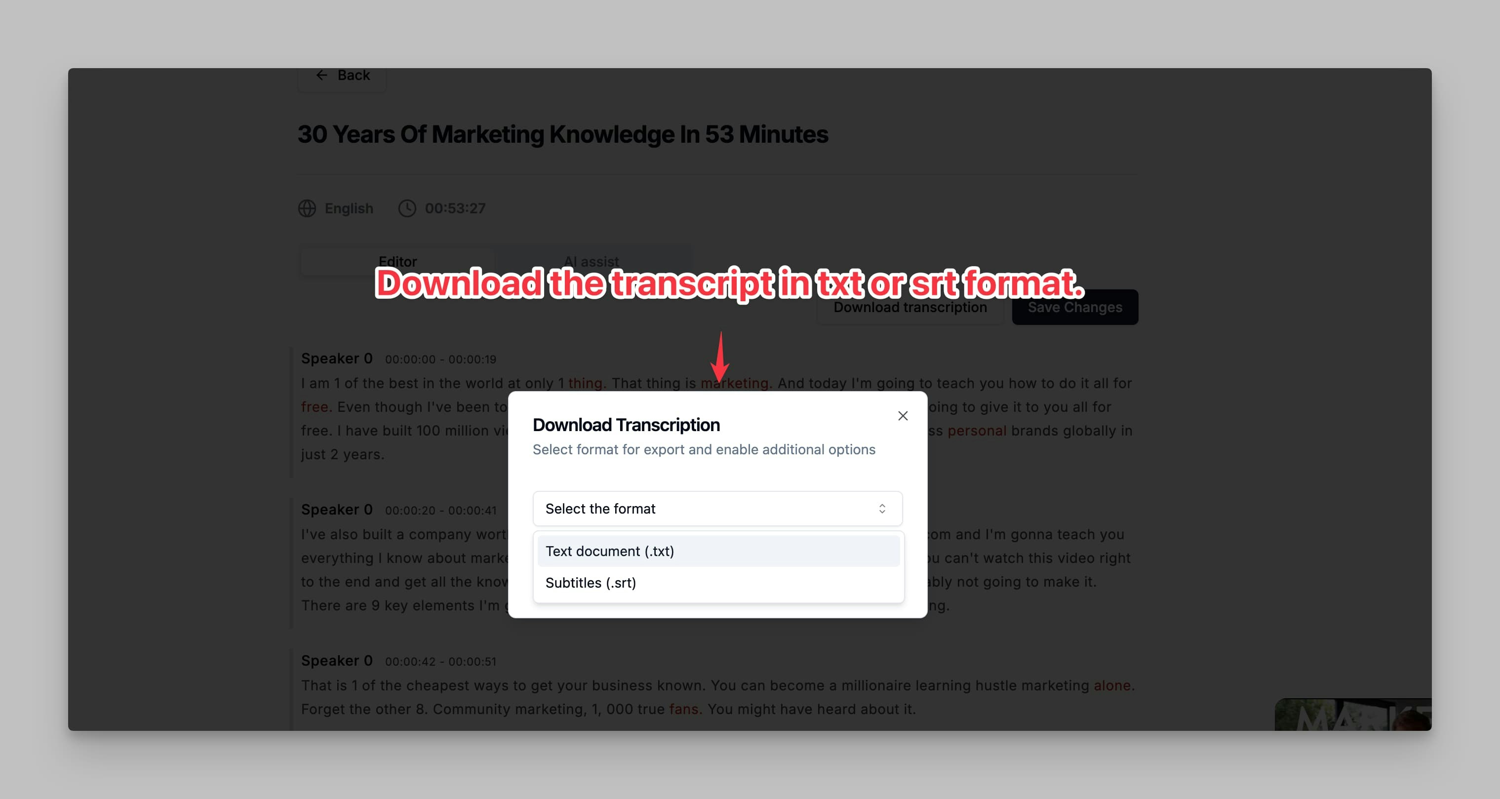 - After editing, you can download the transcription in your preferred format.