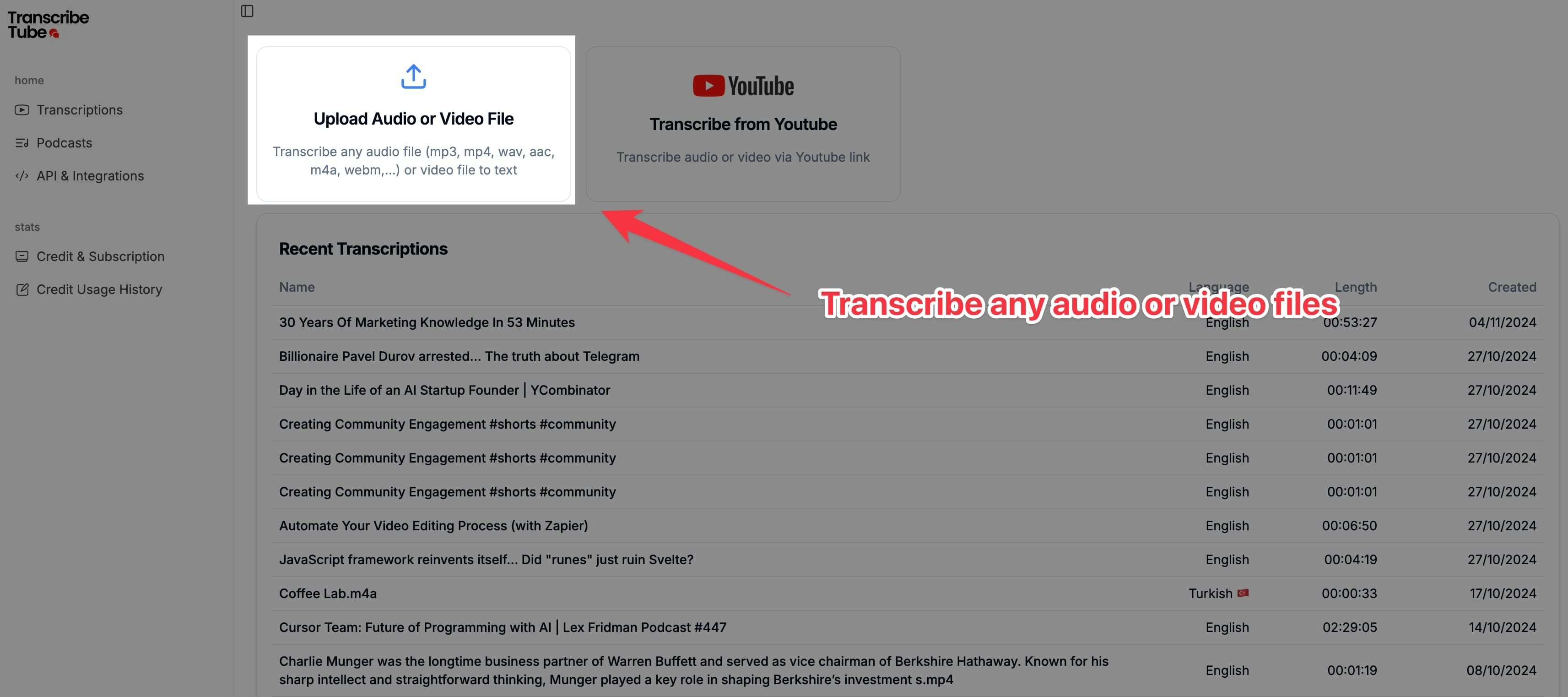 - Go to the TranscribeTube Dashboard.